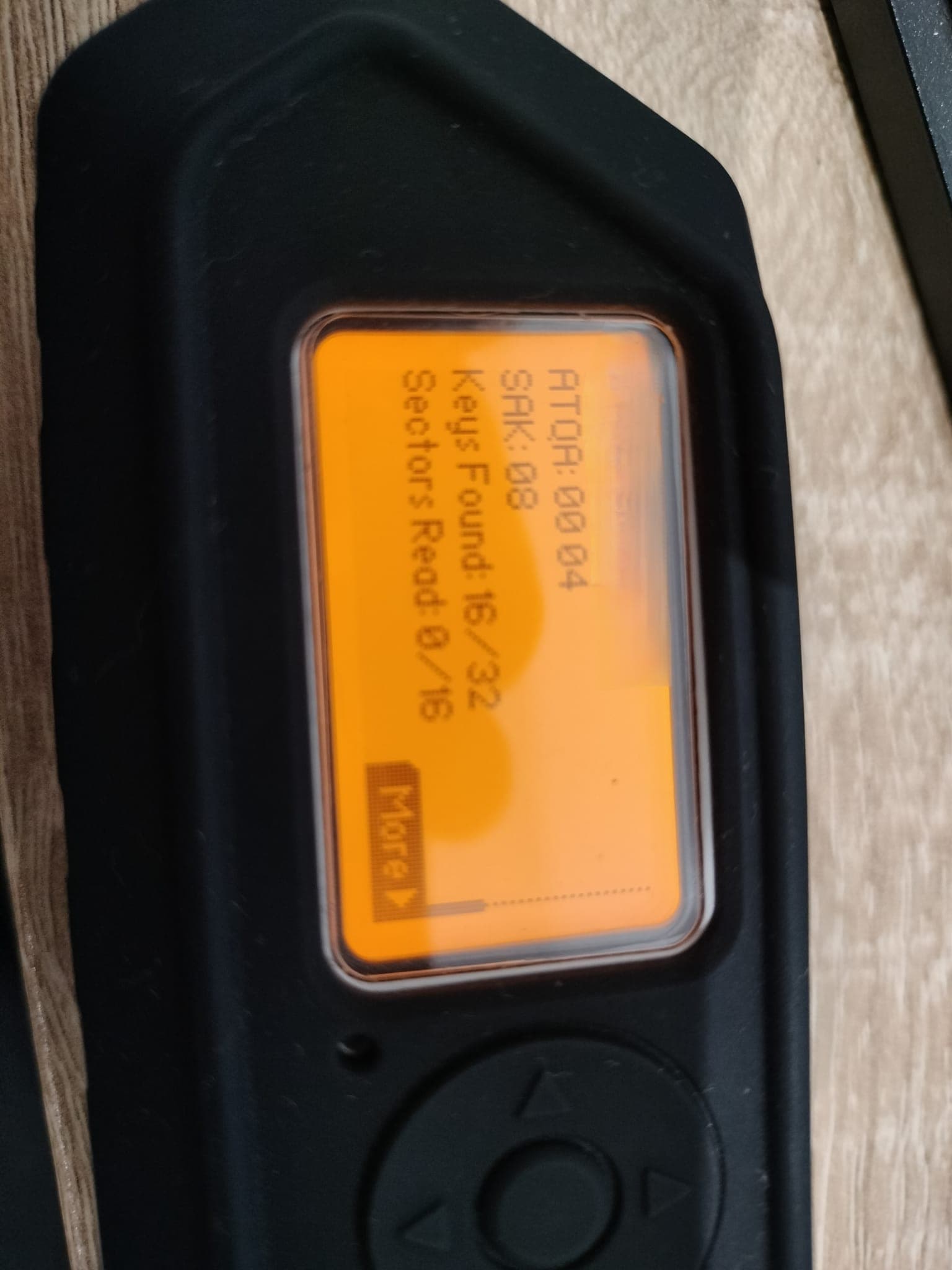 Pero el Flipper no pudo leer todas las Keys (31/32) pero si todos los sectores (16/16). Según tengo entendido, hay algunas keys que se encuentran directamente en el lector de NFC. Entonces el proceso que hice para leerla completamente y abrir con el Flipper fue: